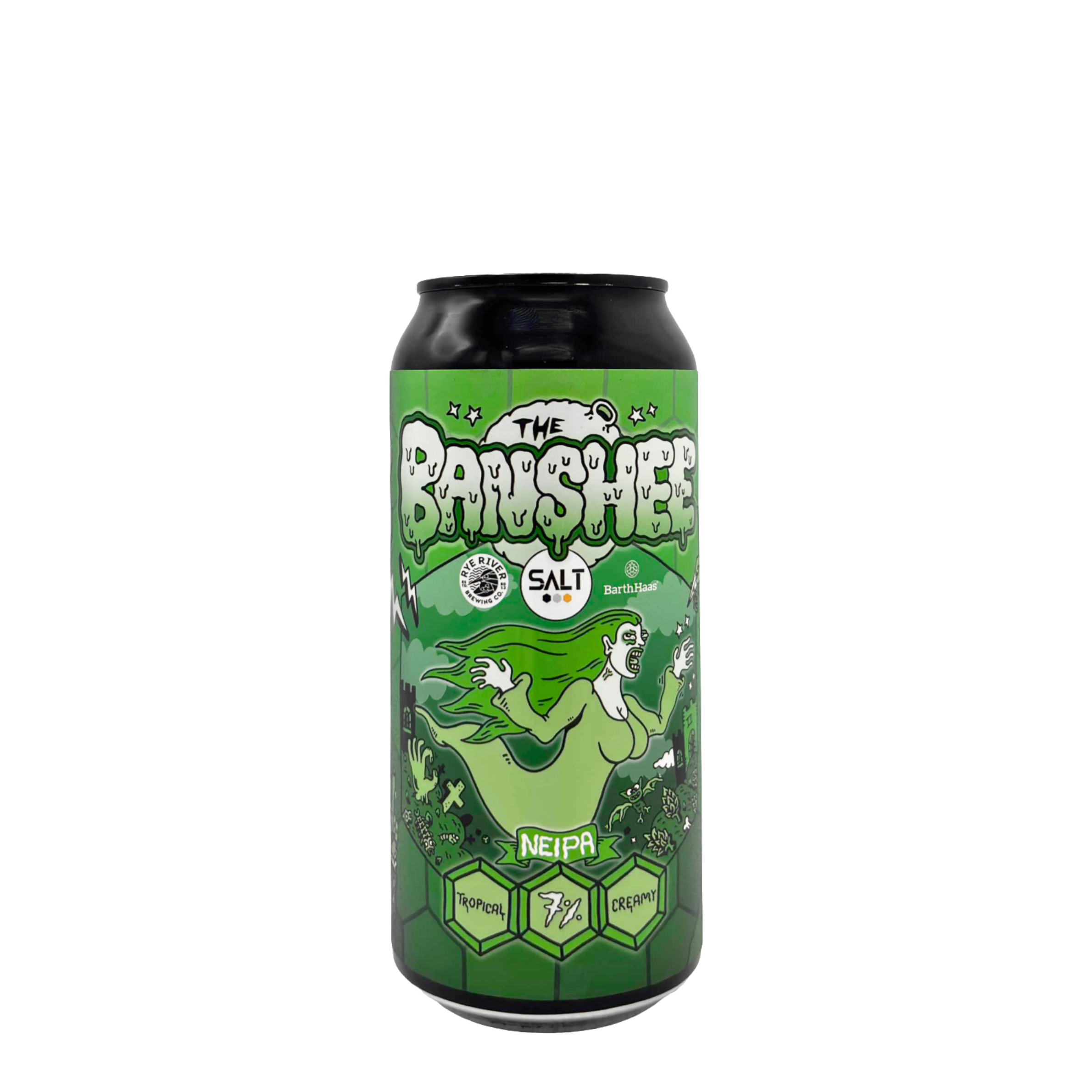 SALT – The Banshee: The Banshee is a 7.0% New England IPA brewed by SALT in collaboration with Rye River Brewing Co, using hops supplied by BarthHaas. The beer is brewed in a hazy NEIPA style with a full-bodied, creamy texture. It is a hop-forward release highlighting tropical and citrus-driven hop character. The label artwork is illustrated by Russell Taysom.